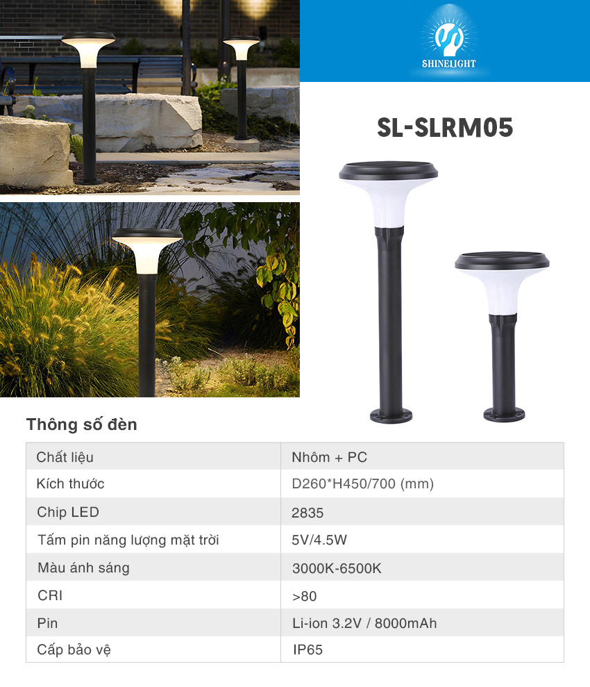 – Đèn nấm sân vườn năng lượng mặt trời SL-SLRM05 là dòng đèn NLMT cao cấp, sử dụng năng lượng mặt trời để phát sáng thông qua cơ chế chuyển hóa năng lượng từ ánh sáng mặt trời thành điện năng.